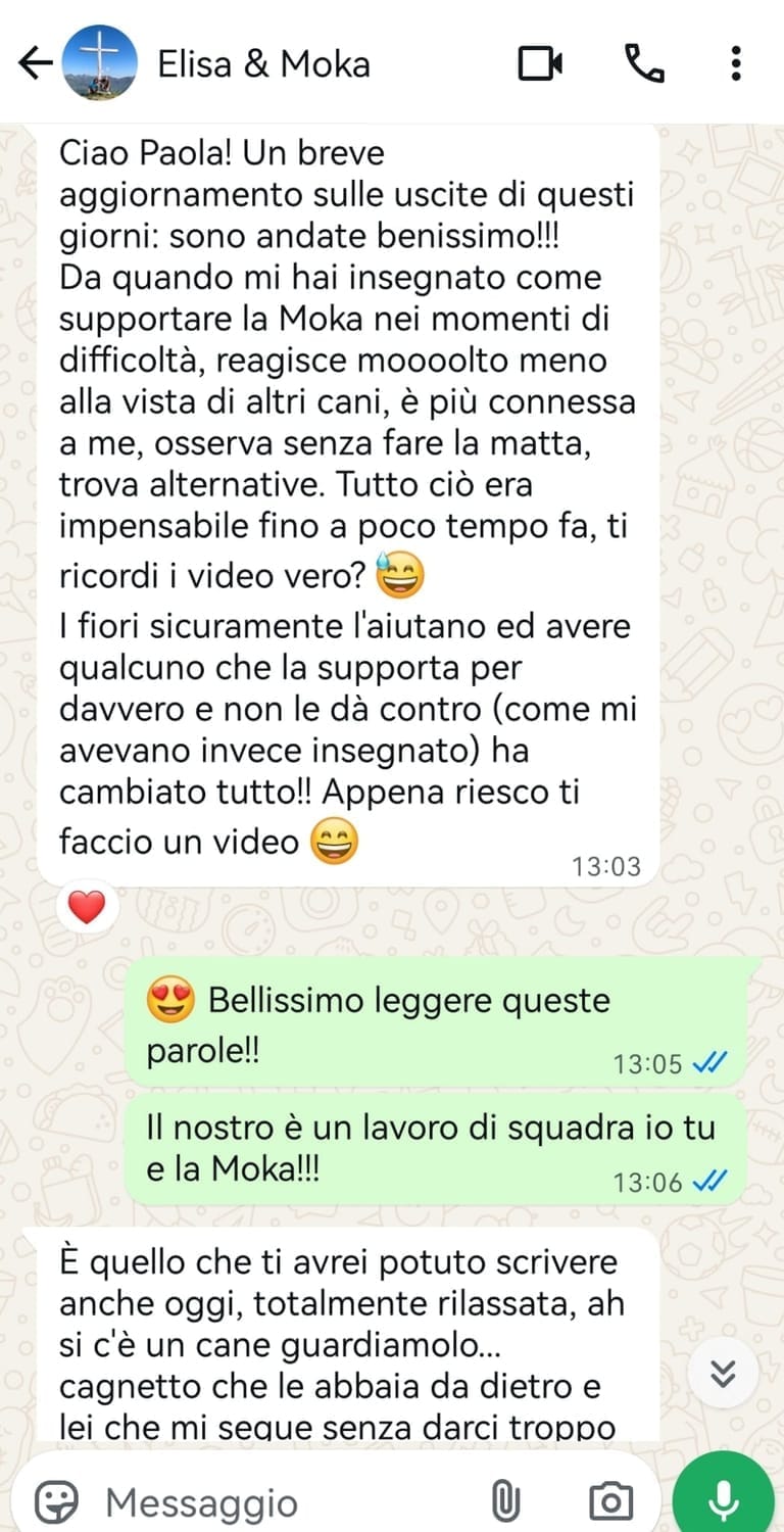 Poi abbiamo posto l'attenzione anche sul fuori, e Sara ha potuto sperimentare come essere più calma e presente per lui durante le passeggiate lo ha aiutato con la reattività verso gli altri cani.