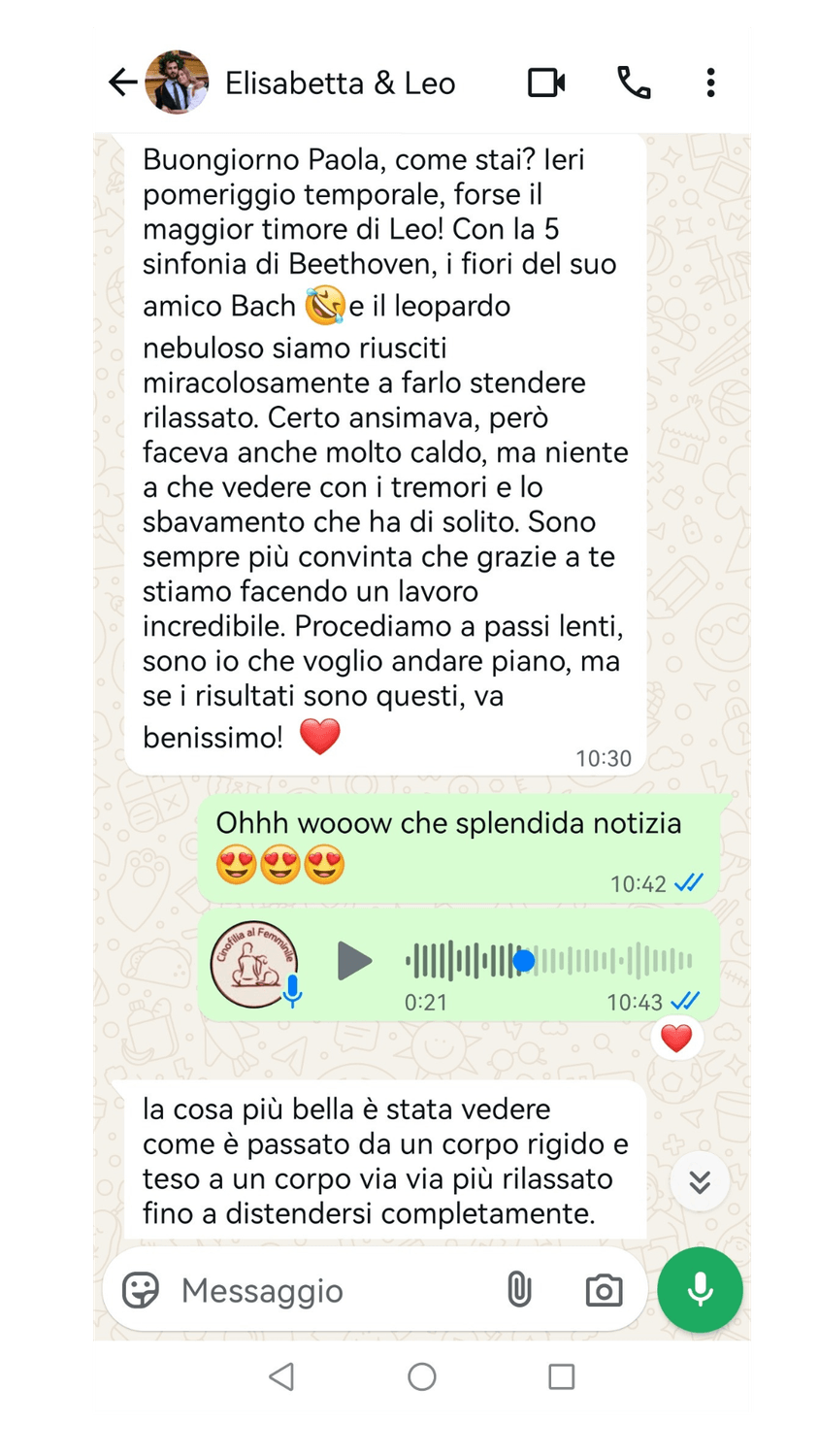 Con le strategie calmanti (tutte naturali) che insegno ai proprietari + il supporto dei fiori di Bach che spesso inserisco nei miei percorsi, ecco come sono cambiate le cose per Leo.